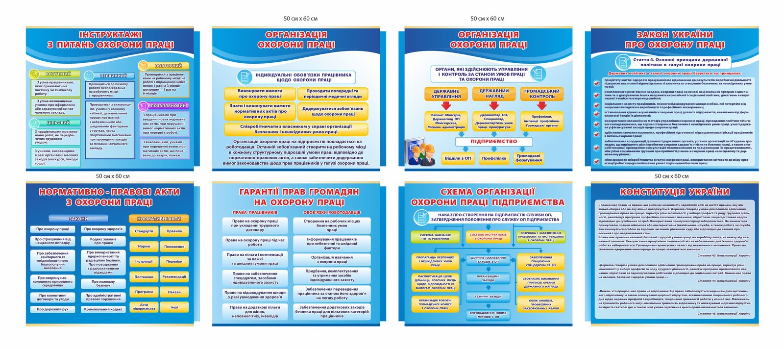 Будь-яка діяльність, пов’язана з працею в офісі, на виробництві або на будівельному майданчику, супроводжується певними ризиками для здоров’я та життя працівників. Для зниження цих ризиків необхідно дотримуватися правил з охорони праці та техніки безпеки. Законодавство встановлює чіткі принципи та норми, які регулюють організацію охорони праці. Стенди з охорони праці допомагають нагадувати працівникам про важливі правила та заходи безпеки.