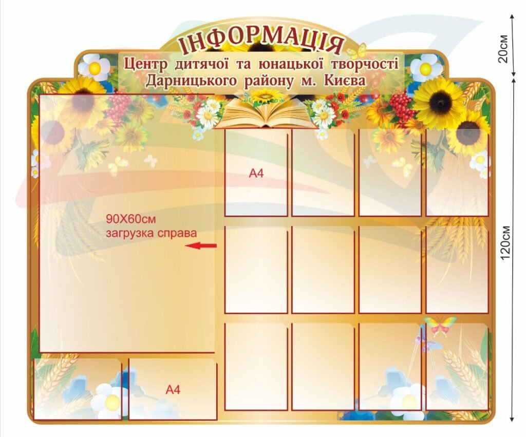 Купити – Інформаційний стенд для центру дитячої творчості «Stendschool.com» Ви можете, зателефонувавши за номерами, які вказані у верхній частині сайту. Усі представлені стенди виготовлені з високоякісного ПВХ (пластику) товщиною 3 мм, який вкривається плівкою з повнокольоровим друком. «Кишені», в свою чергу, з прозорого пластику, який з часом не змінює колір. При транспортуванні ми огортаємо стенд у гофрокартон, що дозволяє безпечно їх транспортувати без ризику пошкодження.
