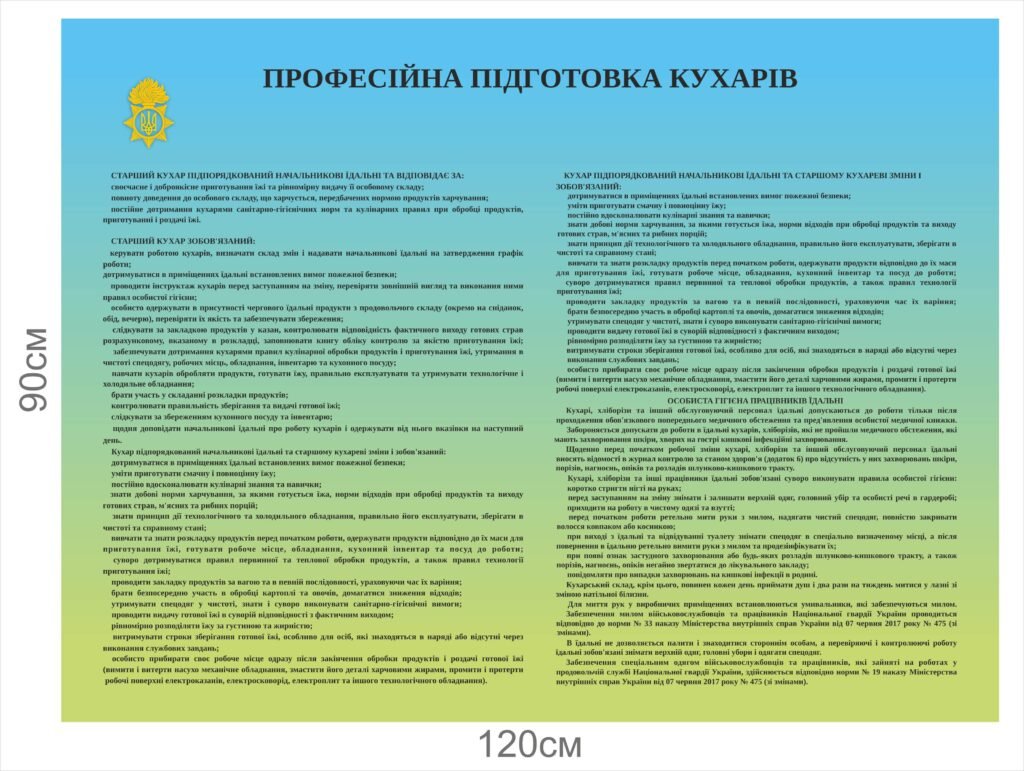 та інших підрозділів, де важливо чітко витримувати технологію приготування страв.Ви можете замовити як повний комплект стендів для їдальні військової частини,