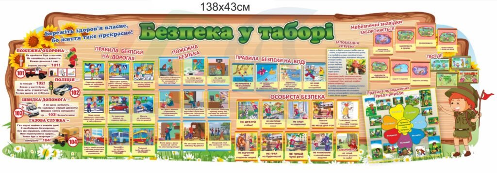 Купити – Стенд “Безпека у дитячому таборі” «Stendschool.com» Ви можете, зателефонувавши за номерами, які вказані у верхній частині сайту, або оформити замовлення самостійно на сайті. Усі представлені стенди виготовлені з високоякісного ПВХ (пластику) товщиною 3 мм, який вкривається плівкою з повнокольоровим друком. «Кишені», в свою чергу, з прозорого пластику, який з часом не змінює колір. При транспортуванні ми огортаємо стенд у гофрокартон, що дозволяє безпечно їх транспортувати без ризику пошкодження.