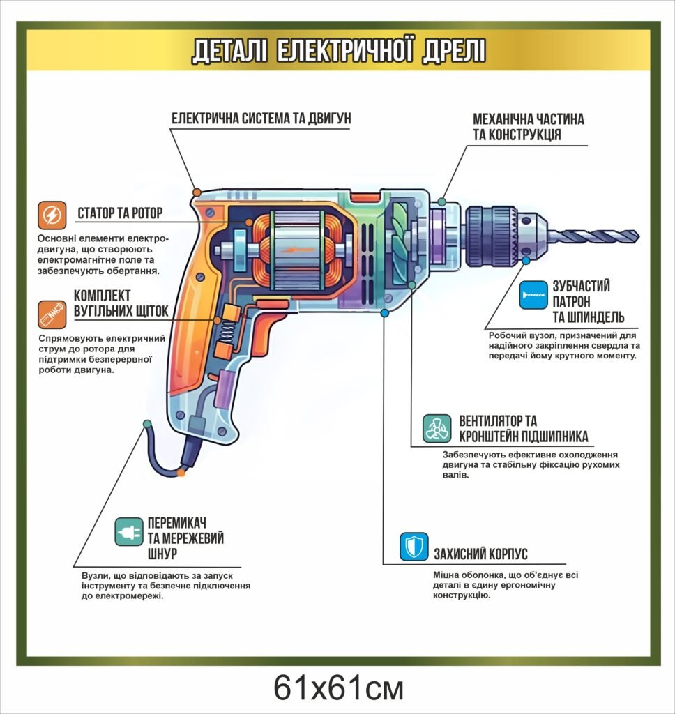 Купити – Стенд “Деталі електичної дрелі” – «Stendschool.com» Ви можете натиснувши кнопку “Додати в кошик”, або зателефонувавши за номерами – 050-645-61-81, 068-648-80-99.
