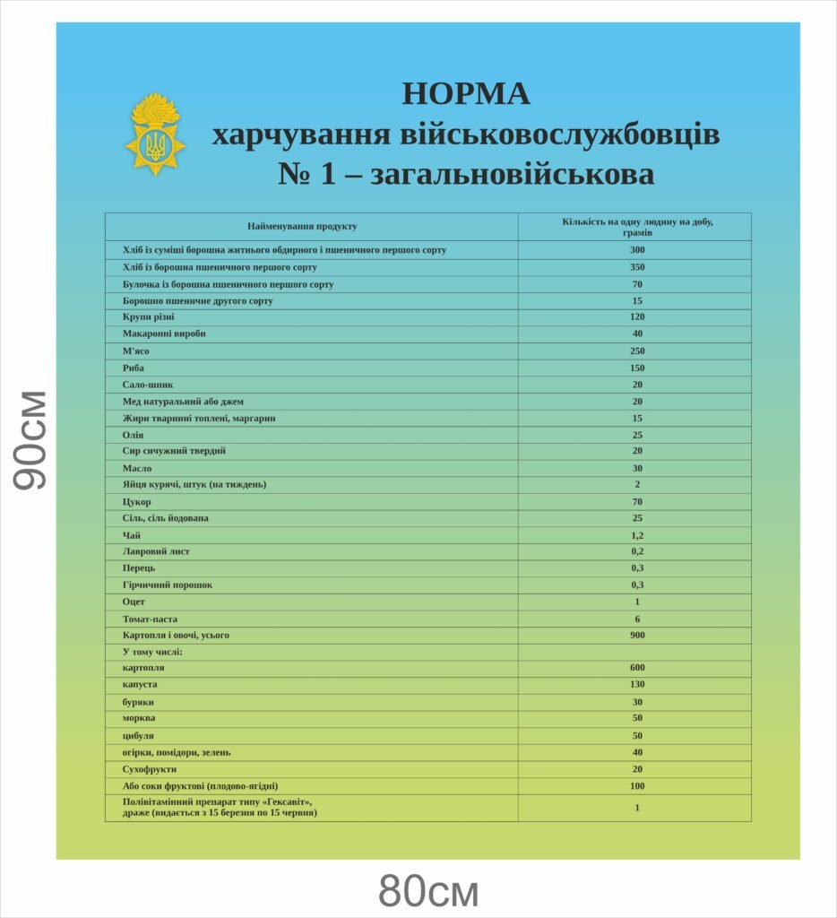 Купити – Стенд “Норма харчування військовослужбовців №1 – Загальновійськова” – «Stendschool.com»