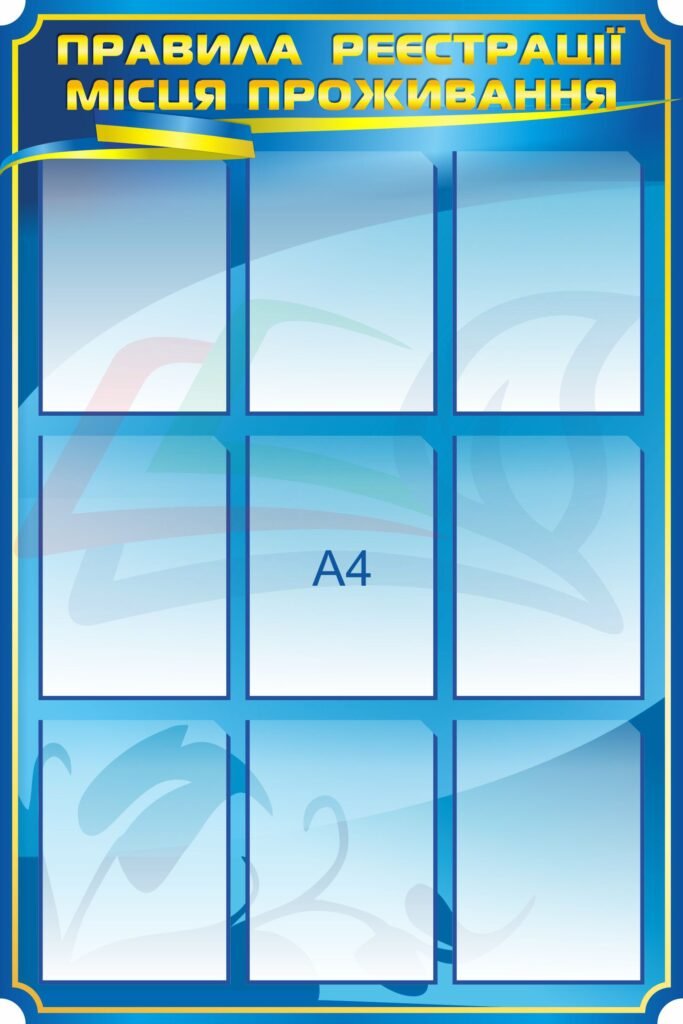 Купити – Стенд “Права реєстрації місця проживання” «Stendschool.com» Ви можете, зателефонувавши за номерами, які вказані у верхній частині сайту, або оформити замовлення самостійно на сайті. Усі представлені стенди виготовлені з високоякісного ПВХ (пластику) товщиною 3 мм, який вкривається плівкою з повнокольоровим друком. «Кишені», в свою чергу, з прозорого пластику, який з часом не змінює колір. При транспортуванні ми огортаємо стенд у гофрокартон, що дозволяє безпечно їх транспортувати без ризику пошкодження.