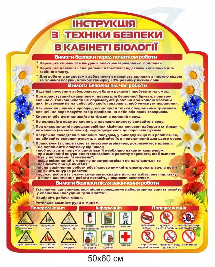 Купити – Стенд “Правила безпеки в кабінеті біології” «Stendschool.com» Ви можете, зателефонувавши за номерами, які вказані у верхній частині сайту, або оформити замовлення самостійно на сайті. Усі представлені стенди виготовлені з високоякісного ПВХ (пластику) товщиною 3 мм, який вкривається плівкою з повнокольоровим друком. «Кишені», в свою чергу, з прозорого пластику, який з часом не змінює колір. При транспортуванні ми огортаємо стенд у гофрокартон, що дозволяє безпечно їх транспортувати без ризику пошкодження.