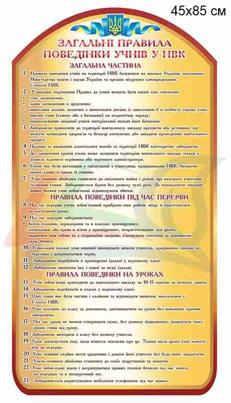 Стенд “Правила поведінки учнів у НВК” містить важливі правила та норми поведінки для учнів навчально-виховного комплексу