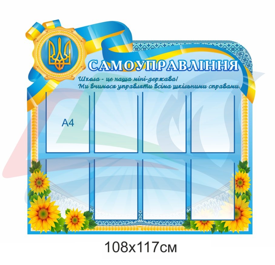 Стенд “Самоуправління” для школи розміром 108×117 см з відділеннями для аркушів формату А4, оформлений в національних кольорах України, з зображенням державного герба та прикрасами з соняшників