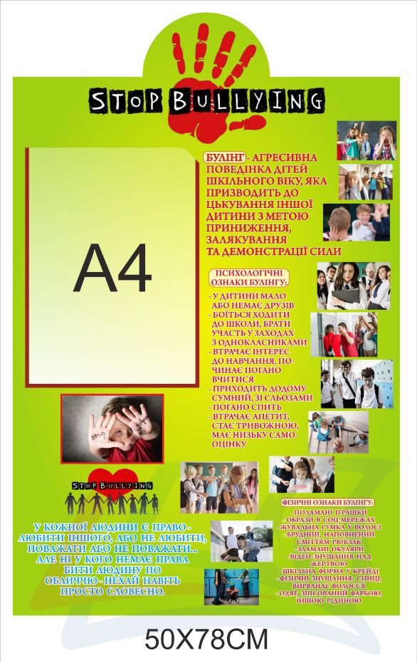 Купити – Стенд “СТОП Булінг” для школи «Stendschool.com» Ви можете, зателефонувавши за номерами, які вказані у верхній частині сайту, або оформити замовлення самостійно на сайті. Усі представлені стенди виготовлені з високоякісного ПВХ (пластику) товщиною 3 мм, який вкривається плівкою з повнокольоровим друком. «Кишені», в свою чергу, з прозорого пластику, який з часом не змінює колір. При транспортуванні ми огортаємо стенд у гофрокартон, що дозволяє безпечно їх транспортувати без ризику пошкодження.