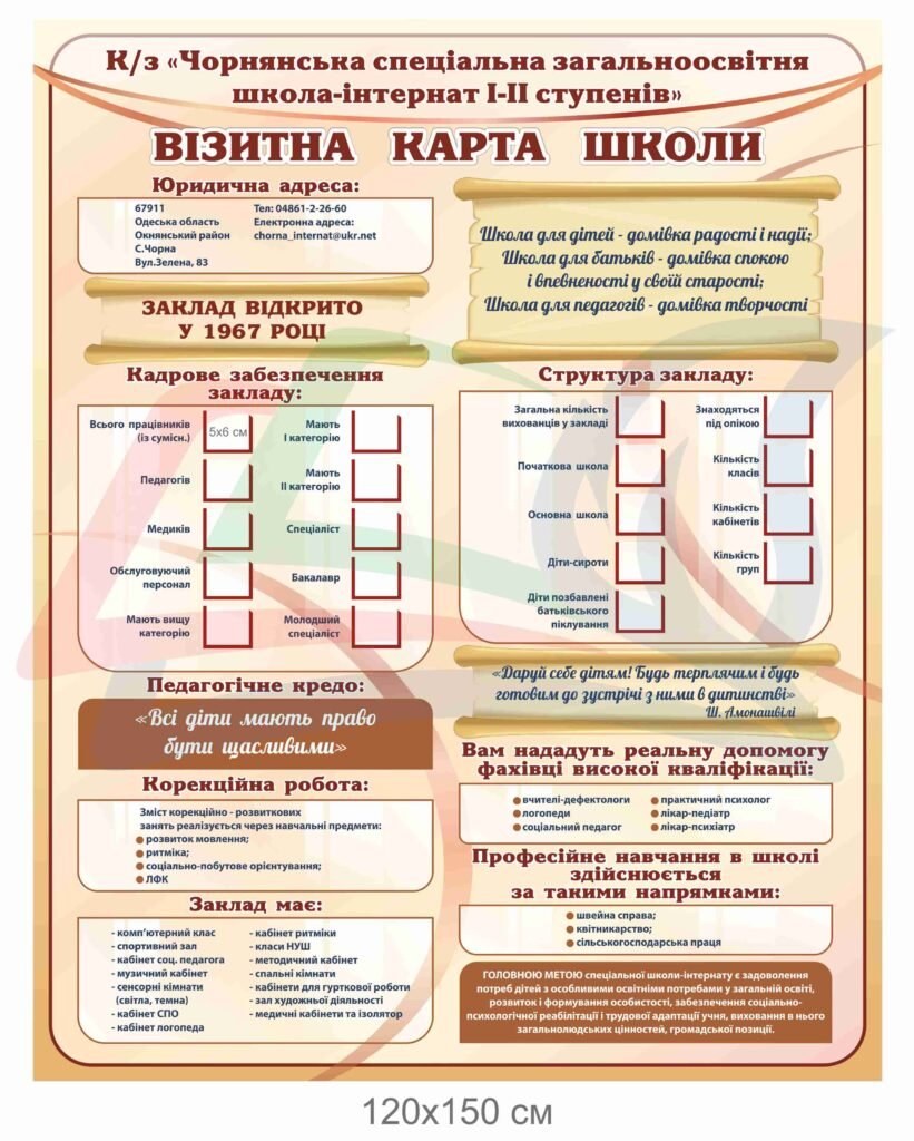 Стенд “Візитна картка школи-інтернат” — інформаційна дошка, що містить основну інформацію про школу-інтернат: історію, досягнення, освітні програми тощо.