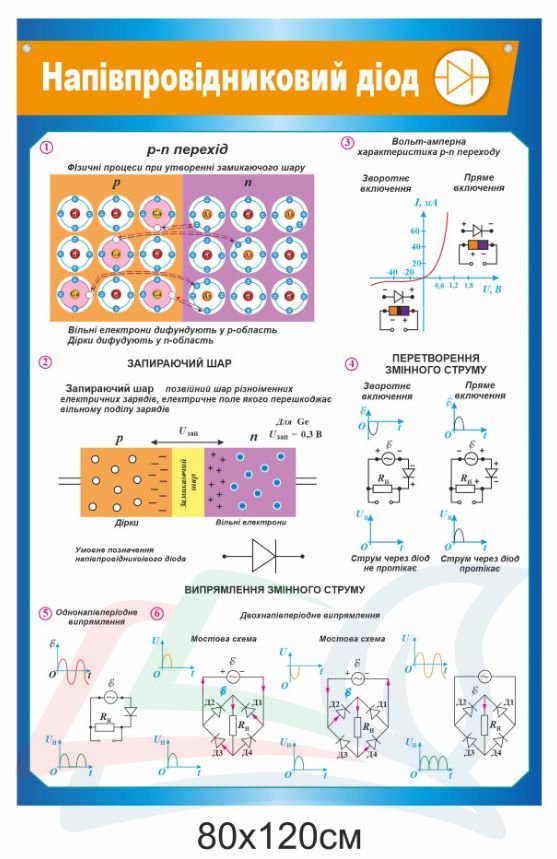 Купити – Стенд з фізики “Напівпровідниковий діод” «Stendschool.com» Ви можете, зателефонувавши за номерами, які вказані у верхній частині сайту, або оформити замовлення самостійно на сайті. Усі представлені стенди виготовлені з високоякісного ПВХ (пластику) товщиною 3 мм, який вкривається плівкою з повнокольоровим друком. «Кишені», в свою чергу, з прозорого пластику, який з часом не змінює колір. При транспортуванні ми огортаємо стенд у гофрокартон, що дозволяє безпечно їх транспортувати без ризику пошкодження.