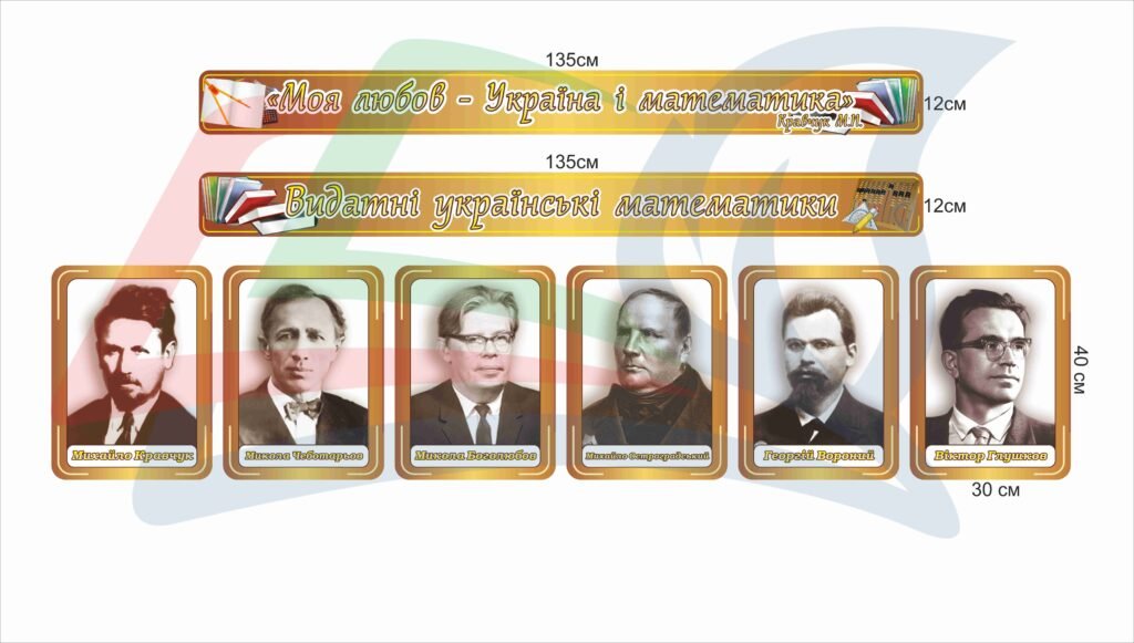 Портрети видатних українських математиків розміром 40х30 см: Михайло Кравчук, Микола Чеботарьов, Микола Боголюбов, Михайло Остроградський, Георгій Вороний, Віктор Глушков. Стенд призначений для ознайомлення учнів із видатними діячами української математичної науки та підвищення інтересу до вивчення математики