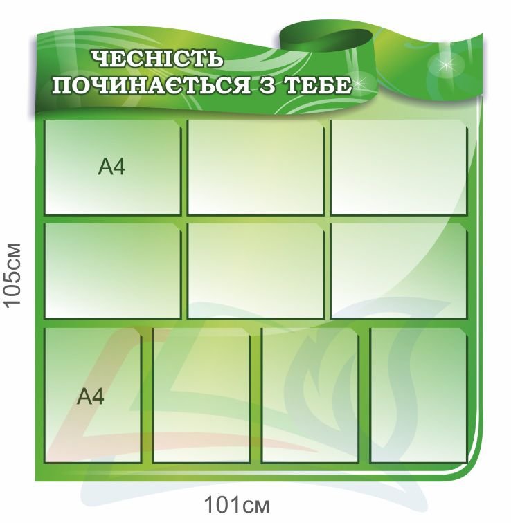 Купити – Стенд “Чесність починається з тебе” «Stendschool.com» Ви можете, зателефонувавши за номерами, які вказані у верхній частині сайту, або оформити замовлення самостійно на сайті. Усі представлені стенди виготовлені з високоякісного ПВХ (пластику) товщиною 3 мм, який вкривається плівкою з повнокольоровим друком. «Кишені», в свою чергу, з прозорого пластику, який з часом не змінює колір. При транспортуванні ми огортаємо стенд у гофрокартон, що дозволяє безпечно їх транспортувати без ризику пошкодження.