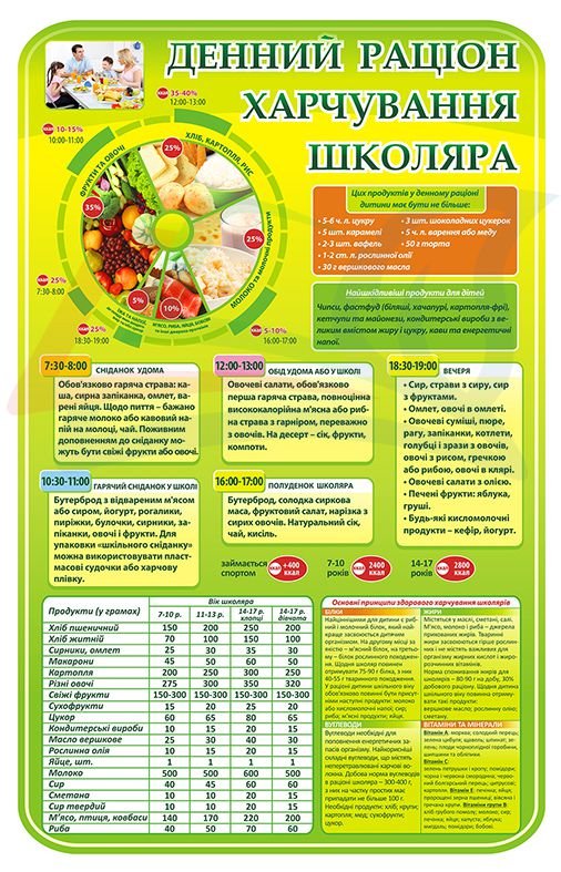 Купити – Стенд для їдальні “Денний раціон харчування школяра” «Stendschool.com» Ви можете, зателефонувавши за номерами, які вказані у верхній частині сайту, або оформити замовлення самостійно на сайті. Усі представлені стенди виготовлені з високоякісного ПВХ (пластику) товщиною 3 мм, який вкривається плівкою з повнокольоровим друком. «Кишені», в свою чергу, з прозорого пластику, який з часом не змінює колір. При транспортуванні ми огортаємо стенд у гофрокартон, що дозволяє безпечно їх транспортувати без ризику пошкодження.