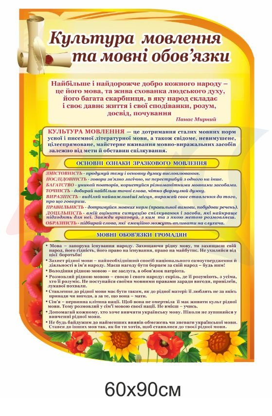 Купити – Стенд “Культура мовлення та мовні обов’язки” «Stendschool.com» Ви можете, зателефонувавши за номерами, які вказані у верхній частині сайту, або оформити замовлення самостійно на сайті. Усі представлені стенди виготовлені з високоякісного ПВХ (пластику) товщиною 3 мм, який вкривається плівкою з повнокольоровим друком. «Кишені», в свою чергу, з прозорого пластику, який з часом не змінює колір. При транспортуванні ми огортаємо стенд у гофрокартон, що дозволяє безпечно їх транспортувати без ризику пошкодження.