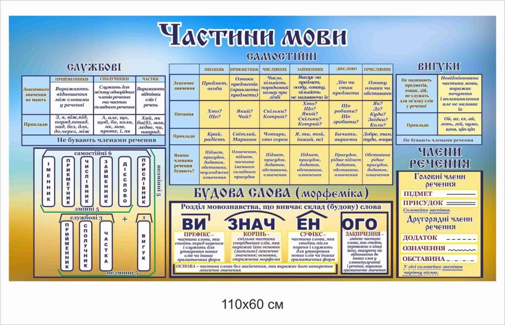 Купити – Стенд з української мови “Частини мови” «Stendschool.com» Ви можете, зателефонувавши за номерами, які вказані у верхній частині сайту, або оформити замовлення самостійно на сайті. Усі представлені стенди виготовлені з високоякісного ПВХ (пластику) товщиною 3 мм, який вкривається плівкою з повнокольоровим друком. «Кишені», в свою чергу, з прозорого пластику, який з часом не змінює колір. При транспортуванні ми огортаємо стенд у гофрокартон, що дозволяє безпечно їх транспортувати без ризику пошкодження.